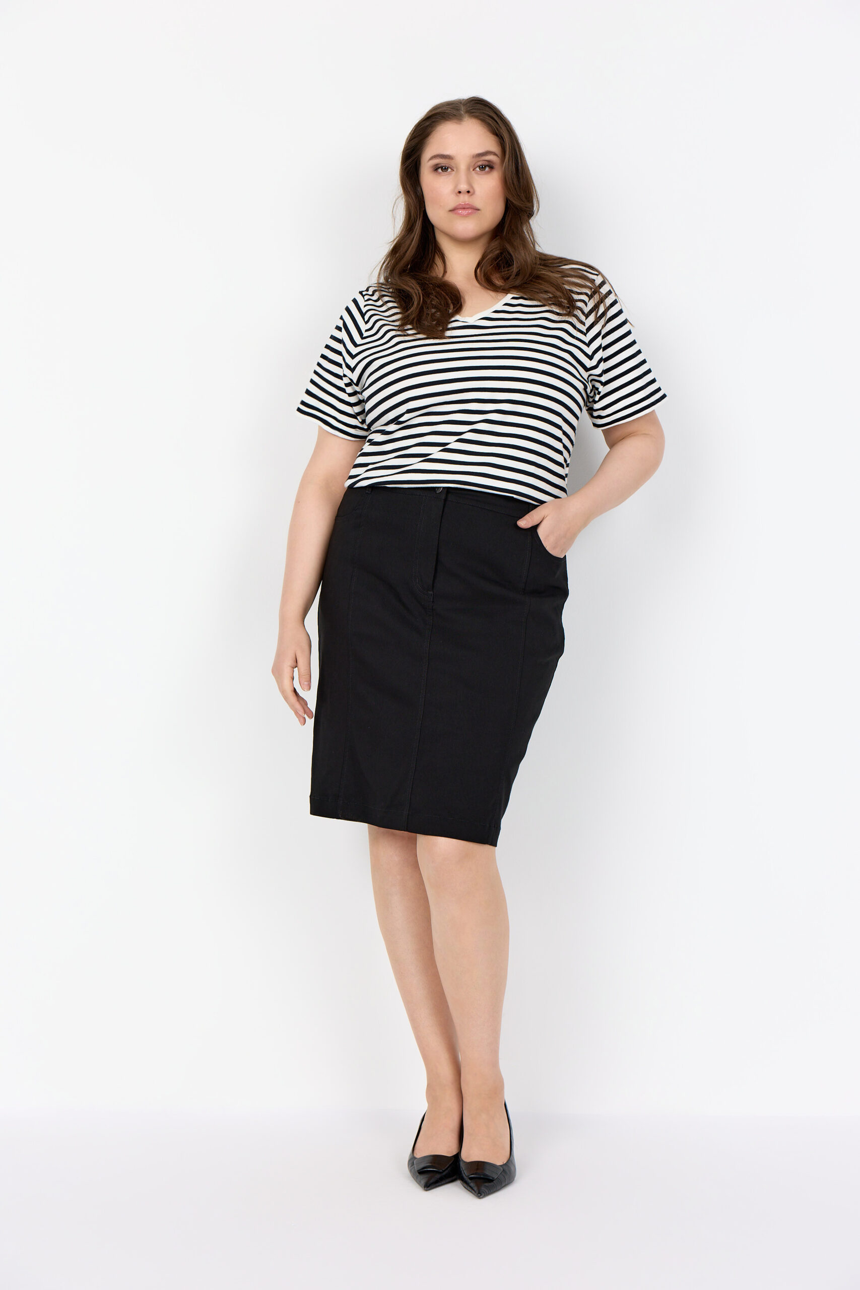 T-shirten er designet med en elegant V-hals, der giver et feminint og let udtryk, mens den afslappede pasform sikrer høj komfort og en ubesværet silhuet. Det klassiske stribede mønster tilfører et stilfuldt touch, som gør modellen nem at style til både hverdag og mere sammensatte outfits.